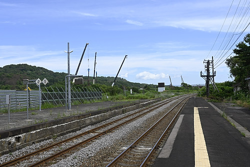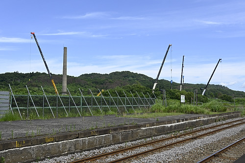 長万部駅方面を見る。北海道新幹線工事用のクレーンが多数見える。