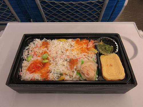 酢飯の上に、甘えびをたっぷり並べて覆い、菜の花と甘酢生姜も載せ、だし醤油を添えたお弁当です。お弁当でこれだけの量の甘えびを食べられることはあまりないので、ちょっと幸せな気分になります。北海道の日本海側の増毛や羽幌で、甘えびがよく揚がるそうで、そのエリアに近い旭川駅にて駅弁で甘えびが食べられるのはうれしい。