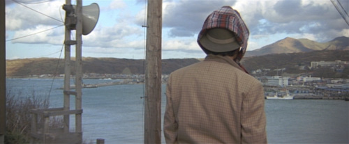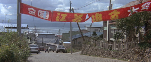 海を背景にした江差の市街地のカットです。映画のカットでは、民謡の「江差追分全国大会」の横断幕が掲げられています。当時と比べるとほとんどの建物が建て替わっています。