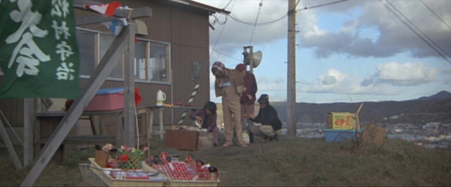 こちらのカットも、かもめ島に登ったすぐの場所にあった小屋付近です。映画のカットに写る拡声器や木造電柱も現在は存在しません。