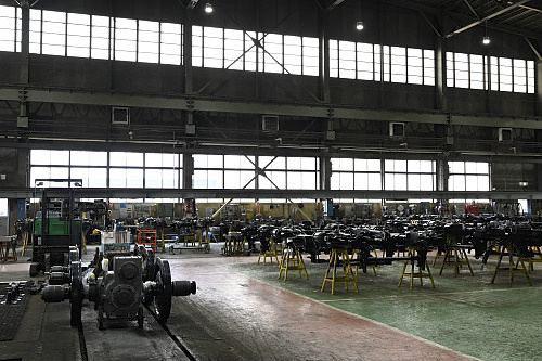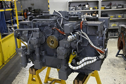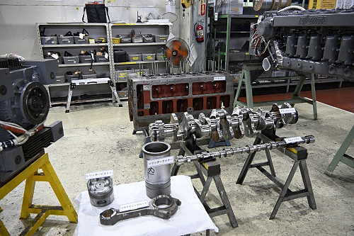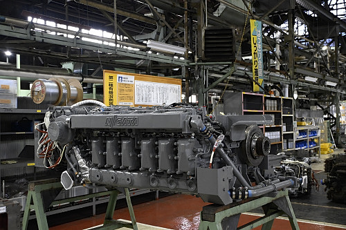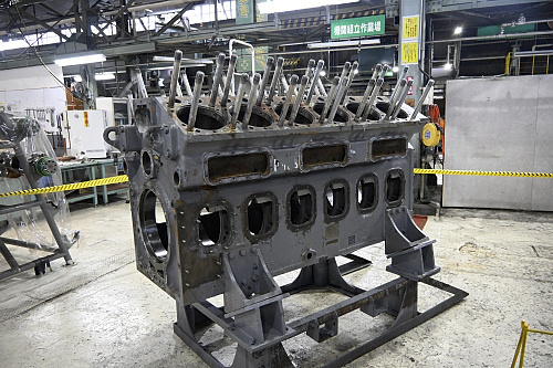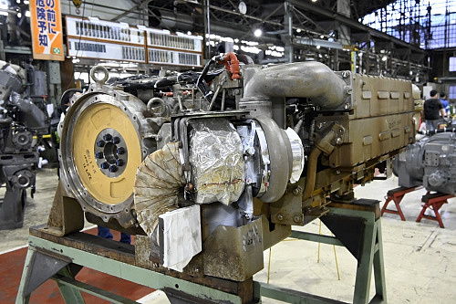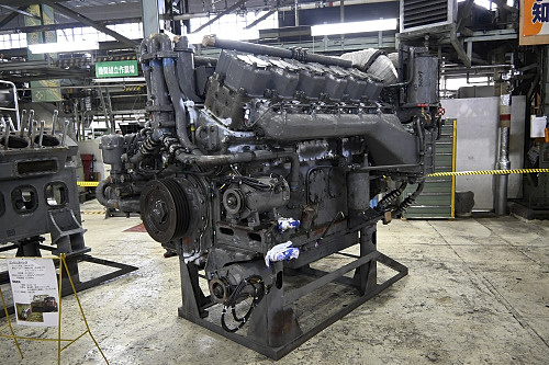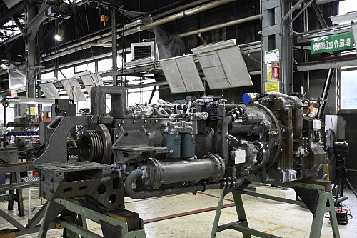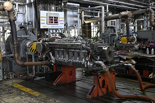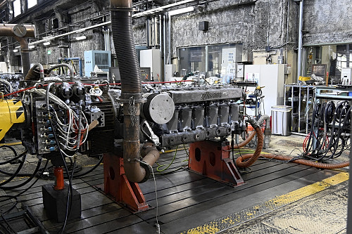 馬力試験室に並ぶディーゼルエンジン。分解検査後は車両搭載前にここで試運転が行われる。