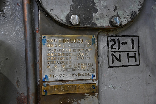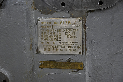 エンジンの製造銘板。神鋼造機製。昭和48年8月の製造。