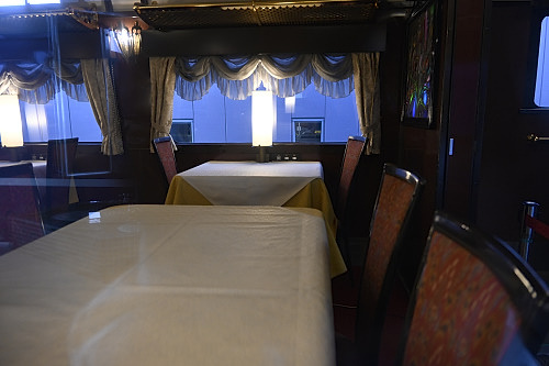 落ち着いた豪華な車内。提供される料理は、フランス料理のコース料理だった。